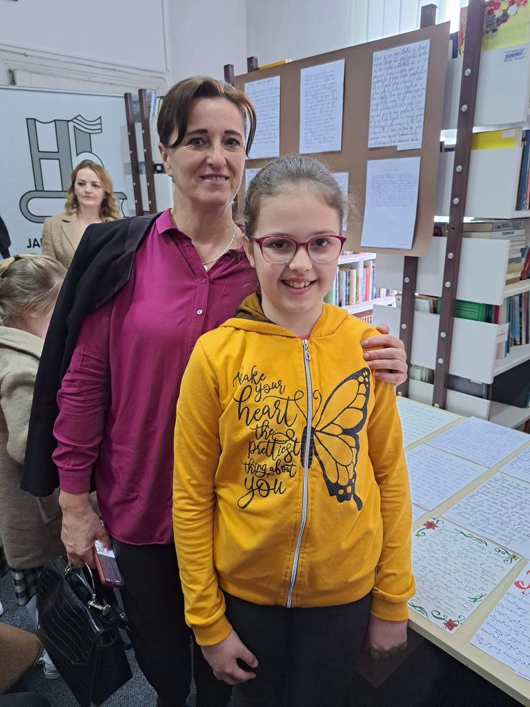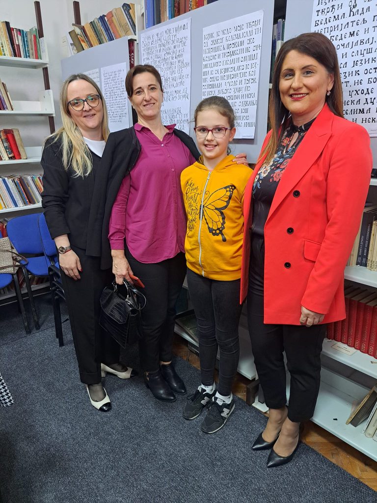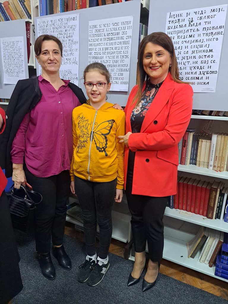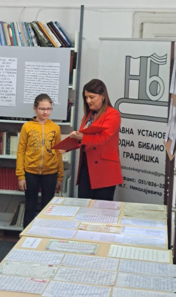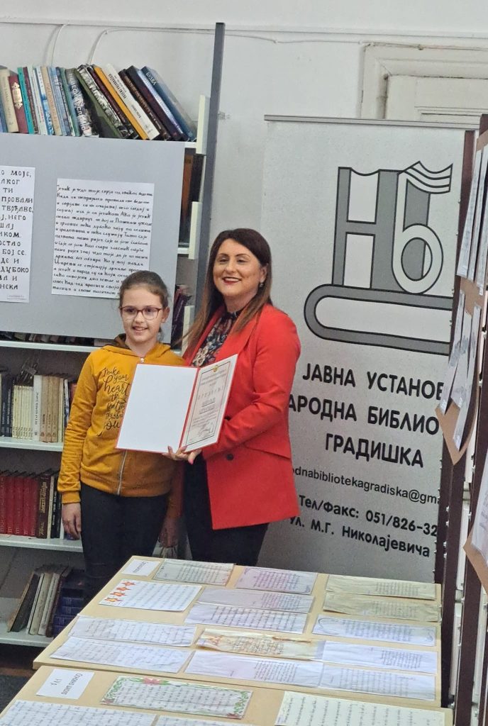 ЈУ Народна библиотека Градишка је у јануару расписала Конкурс за избор најљепшег ћириличног рукописа “ Језик наш насушни“. До 1. марта колико је Конкурс био отворен пристигло је 1190 радова у четири категорије. Наша ученица петог разреда Наталија Самарџија је у категорији млађих основаца ( од 1. до 5. разреда) на Конкурсу заузела треће мјесто. Свечана завршна манифестација, изложба одабраних радова те уручење награда уприличена је у Читаоници ЈУ Народне библиотеке Градишка 27.3.2023.год.